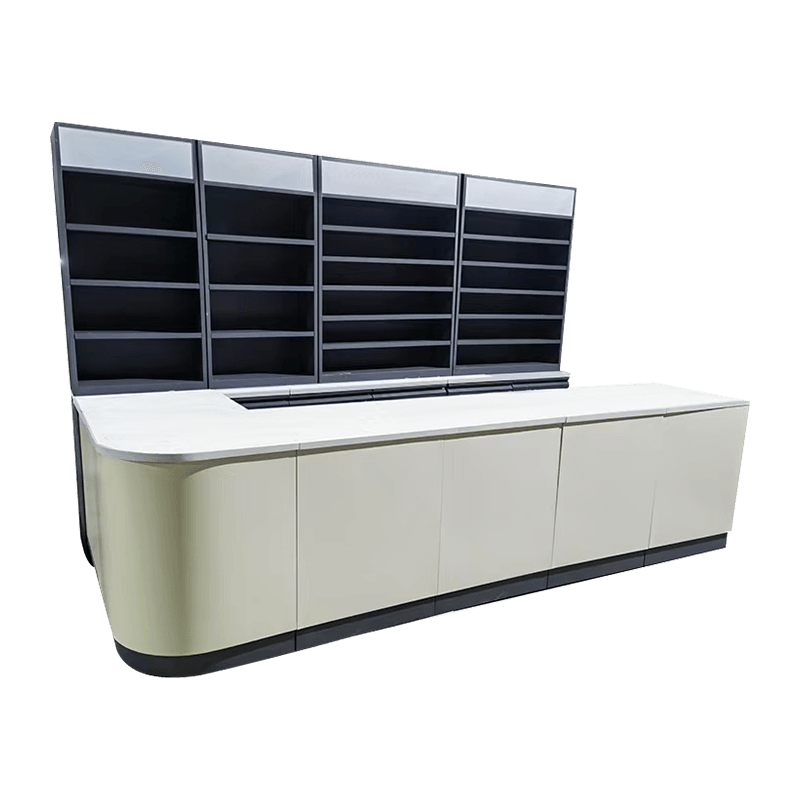 Dearadh fíorálainn, an-eirgeanamaíochta, rud a fhágann go mbraitheann custaiméirí compordach agus áisiúil ag an tseiceáil amach. Tá an countertop fairsing agus cothrom, rud a fhágann go bhfuil sé áisiúil d'airgeadóirí cóid a scanadh go tapa agus cuntais a shocrú, chomh maith le do chustaiméirí earraí beaga a cheannaíonn siad go sealadach a chur, mar guma coganta, candies mint, agus earraí tomhaltóra ríogacha eile.