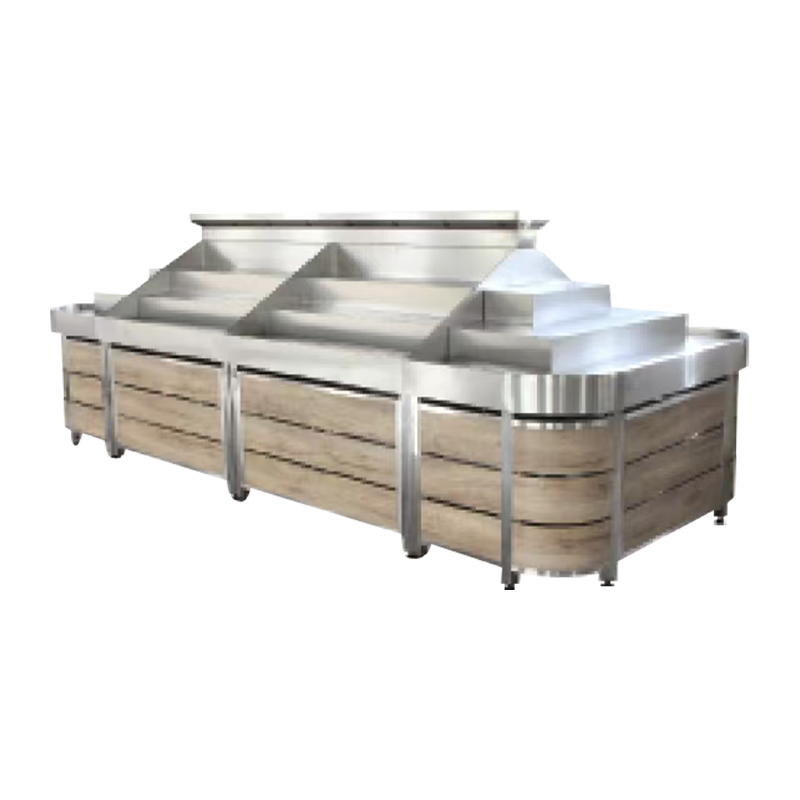 Tá an dearadh struchtúrach ilchisealach agus solúbtha, rud a ligeann do choigeartú saor in aisce de réir mhéideanna, cruthanna agus díolacháin éagsúla torthaí agus glasraí. Úsáideann an táirge meascán de mhiotail ard-neart, creimeadh-resistant agus ábhair adhmaid ard-chaighdeán atá neamhdhíobhálach don chomhshaol, atá snasta go cúramach agus le chéile go daingean. Tá an struchtúr cobhsaí agus is féidir leis meáchan líon mór torthaí agus glasraí a sheasamh go héasca, chomh maith le hoibríochtaí láimhseála agus sórtála go minic. Tá meaitseáil dath agus roghnú ábhar an raca glasraí an-álainn freisin, le dathanna simplí agus galánta agus ábhair uigeachta nádúrtha, ag cruthú atmaisféar nádúrtha atá gar do nádúr